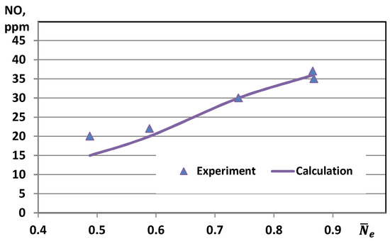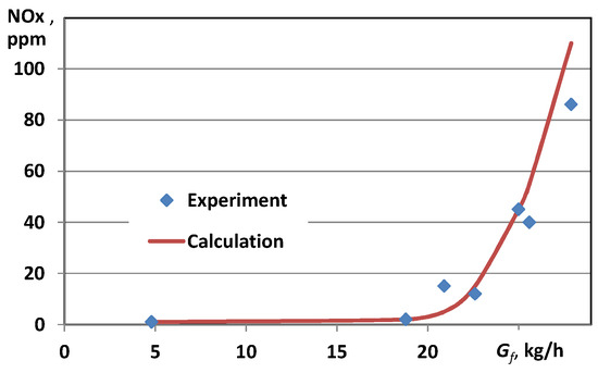 To verify the mathematical model proposed in Section 2.1, we calculated the emission of NO in the combustor with the premixing of components shown in Figure 2, working on natural gas. The results of the estimations were compared with the data of physical experiments obtained at the experimental combustion chamber [91]. The comparison for different working regimes, which differ in the consumption of gaseous fuel (natural gas) through the nozzle , are shown in Figure 4. Good agreement with the data is seen. The correlation coefficient between the results of experiments and numerical calculations is 0.985. A match was also made between the numerical and experimental data on the combustion product’s temperature at twenty-five controlled measuring points for seven working regimes, which showed that the maximum discrepancy in finding the average temperature did not exceed 3%.