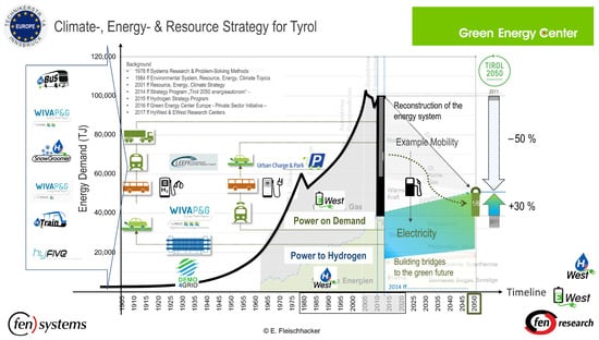 In 2014, the climate, energy, and resources strategy was presented by E. Fleischhacker—then, FEN Sustain Systems GmbH—to the Tyrolean parliament, focusing on the further development of strategic measures and priorities. This aimed to restrain the exponential increase in energy demand through the reconstruction of the Tyrolean energy system and thus to achieve the long-term goals towards energy autonomy and climate neutrality [