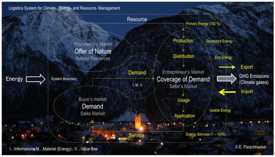 10]. The result of this overlay is the central conception and analysis model for any comprehensive multidisciplinary strategy, project, and product development as well as process-oriented management including quality assurance, monitoring, and the final dissemination process. Within this logistics system—which can be applied to each and every resource management tasks—the right goods (service) in the adequate condition (e.g., qualitatively impeccable) and the proper quantity (neither shortage nor surplus) at the time of request (e.g., according to daily demand) to the place of demand (e.g., household) at the minimum cost is to be delivered. The system consists of the subsystems