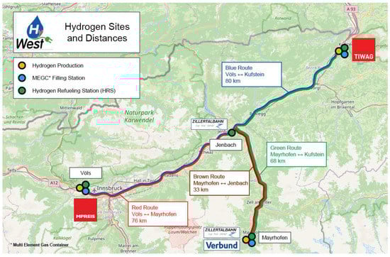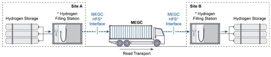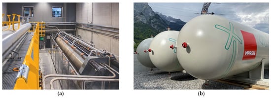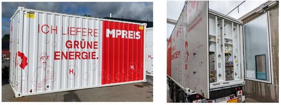 Figure 8. According to the current plan, a hydrogen distribution system based on MEGCs was identified as the favorable solution. In this regard, MPREIS has already ordered and received a 20-foot hydrogen storage container from UMOE Advanced Composites for the setup of the exchange platform. Each container will provide a storage capability of approximately 300 kg of hydrogen (see