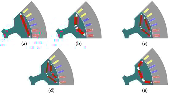 One effective method to improve the anti-demagnetization ability, torque performance, and other performances is by changing the topology of the IPM motor, especially the PM arrangement. Therefore, five basic models with different PM arrangements in the rotor are compared at first to achieve a proper asymmetric rotor structure with potentially high demagnetization prevention capability and comprehensive good multi-physical performance. The design requirements of the IPM motor are listed in Table 1, and Figure 1 shows the cross-sections of five basic IPM motor models. Each model is optimized to provide the required output torque without violating the design constraints. Moreover, for a fair comparison, only the design variables related to the PM arrangement are varied, and the PM material usage, stator structure, and winding configurations of the investigated five basic models keep the same.