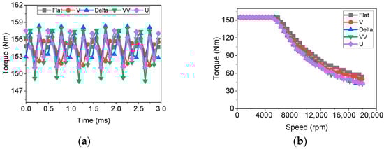 For a fair comparison of five basic IPM motors, the motor structures are selected to generate the same average torque with the same maximum current excitation, as shown in Figure 3a. Figure 3b shows the torque-speed curves of the investigated five basic IPM motors, and it can be seen that they provide similar average torque in the maximum torque per ampere (MTPA) region and different torque decrease speeds in the maximum torque per voltage (MTPV) region. Among them, the Flat-type IPM motor possesses the largest flux weakening region, the V-type IPM motor randing the second, and the other three types of IPM motors have basically the same torque-speed curves.