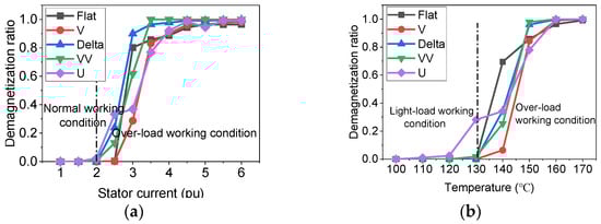 Comparison of demagnetization ratio of five PM arrangements under extreme conditions. (a) Effect of stator current. (b) Effect of temperature.
