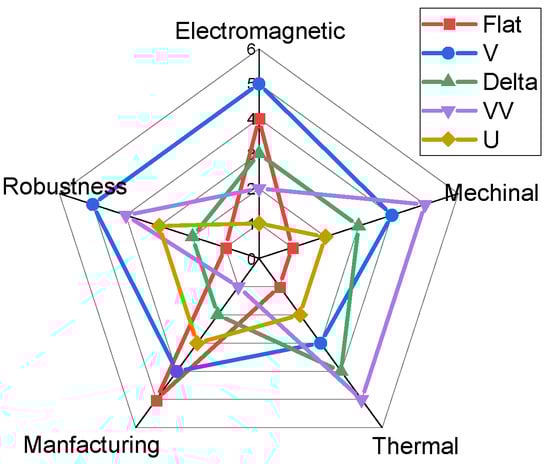 It can be seen from Figure 6 that all of the investigated types of PM arrangements have their advantages and disadvantages, without one standing out very much in all disciplines. Additionally, it is worth noting that each of the investigated motors might be further optimized to improve specific performance, but it is not the focus of this paper. Generally, the above studies provide a reference to choose the proper PM arrangement of the IPM motor for the research purpose of this paper. In the overall rating, the V-type PM arrangement slightly leads the ranking. It has the broadest area with comprehensive consideration of the investigated performances. The VV-type PM arrangement ranks second for its visible advantages of mechanical and thermal characteristics, making it better-suitable for high-speed applications. Moreover, the V- and VV-type PM arrangements perform well in terms of PM demagnetization robustness. Therefore, V and VV PM arrangements are selected for the design of the asymmetric rotor IPM motor with the potentially high anti-demagnetization ability and comprehensive good multi-physical performance balance.