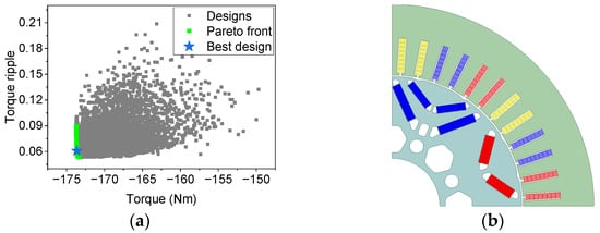 Optimization results. (a) Pareto front. (b) Optimal motor structure.