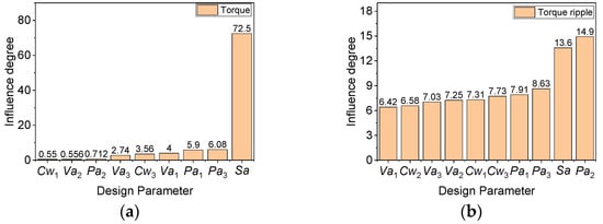 Sensitivity analysis results. (a) Degree of the impact of design parameters on the torque. (b) Degree of the impact of design parameters on the torque ripple.