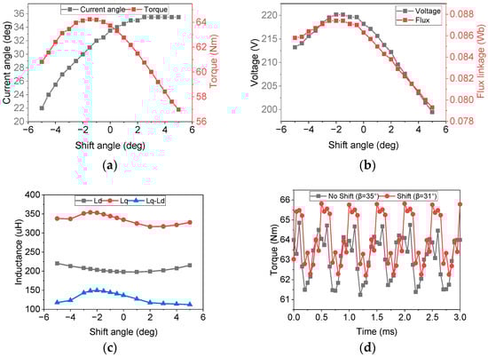 Moreover, Figure 10c shows the influence of the shift angle on d-axis inductance Ld and q-axis inductance Lq. It can be seen that with the increase of the shift angle, the value of Lq first increases and then decreases, and the value of Ld first decreases and then increases. The difference between them, Lq − Ld, also shows a trend of first decreases and then increases. The value of Lq − Ld is closely related to reluctance torque and can be expressed as: