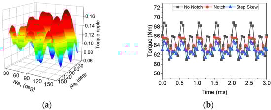 Figure 11a shows the response surface model (RSM) of the rotor notch angles (Na1, Na2) and torque ripple. It can be seen that the design of the rotor notch can reduce the torque ripple effectively. Figure 11b shows the comparison of torque waveforms with the rotor notch and the rotor step skew method, respectively. It is seen that a similar torque ripple to that of the step skew rotor can be obtained by using the asymmetric rotor notch. At the same time, the manufacturing difficulty and cost of the motor can be greatly reduced by using the asymmetric rotor notch.