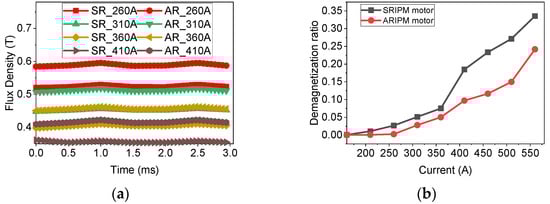 First, the PM demagnetization maps of the symmetric and asymmetric motors are compared, as shown in Figure 12. The PM temperature is set to 140 °C, and the keen point of irreversible demagnetization is 0.4 T. Figure 12b compares the flux density waveforms of a point on the PM corner of the investigated motors under different current excitations. It can be seen that under the excitation of maximum demagnetizing current, irreversible demagnetization will not occur in both motors. Meanwhile, the PM working point of the proposed ARIPM motor is higher than that of the ARIPM motor. In addition, Figure 12b also compares the PM demagnetization ratio of the investigated motors under different current excitations with the same amount of PMs. It can be seen that the proposed ARIPM motor has a lower demagnetization ratio compared with the SRIPM motor, which means that the proposed ARIPM motor has better anti-demagnetization ability. Therefore, the superiority of the PM demagnetization capability of the proposed ASIPM model has been validated.