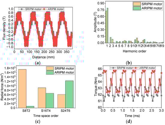Second, the electromagnetic characteristics of the SRIPM and ARIPM motors are compared, as shown in Figure 13. It can be seen from Figure 13a that the spatial distribution of the no-load air-gap flux density of the asymmetric rotor IPM motor is also asymmetric about the 0-axis. After the Fourier transformation, it is seen from Figure 13b that the amplitude of the fundamental flux density is improved. Moreover, the values of some low-order radial electromagnetic forces, which have significate effects on the noise and vibration of the investigated motors, are shown in Figure 13c. It can be seen that by the comprehensive use of asymmetric rotor structures and the rotor notch method, the radial electromagnetic force with a space order of eight and a time order of twp (S8T2) and a space order of 16 and a time order of four (S16T4) are reduced, while the radial electromagnetic force with a space order of 24 and a time order of six (S24T6) is increased. According to the law that the lower the order of radial electromagnetic force, the greater the impact on motor noise and vibration, it can be predicted that the proposed motor possesses good noise and vibration performance. This result can be verified by research on motor torque ripple improvement by using asymmetric motor structures in [,]. The motor torque waveforms with the same amplitude of phase current are shown in Figure 13d. It can be seen that the average torque of the IPM motor with the proposed asymmetric rotor increases by 2.4% compared with that of the IPM motor with the symmetric rotor.