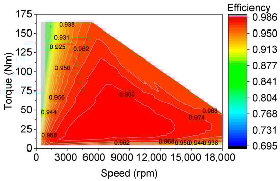 After the electromagnetic performances and robustness validation of the proposed ARIPM motor, the efficiency map of the proposed ARIPM motor is also investigated, as shown in Figure 14. It can be seen that the maximum efficiency of the proposed ARIPM motor is above 97.4%, and the maximum speed of the MTPA working region is nearly 5000rpm, which fulfills the design requirements listed in Table 1.