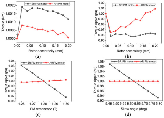 Torque and torque ripple robustness of motors. (a) Torque robustness of SRIPM motor. (b) Torque robustness of ARIPM motor. (c) Torque ripple robustness of SRIPM motor. (d) Torque ripple robustness of ARIPM motor.