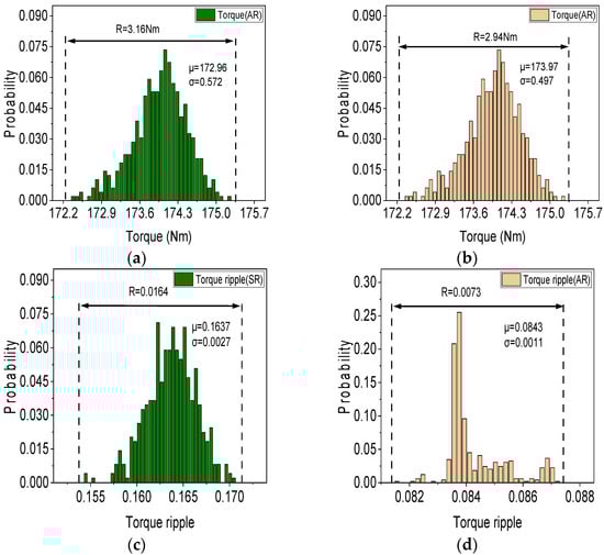 Figure 16 shows the torque and torque ripple robustness considering the comprehensive effects of the investigated manufacturing uncertainties. It can be seen that the performance distributions of torque and torque ripple of the proposed ARIPM motor are more concentrated than those of the SRIPM motor. Meanwhile, the variation range (R), mean value (μ), and standard deviation value (σ) are calculated to indicate the performance robustness. It can also be concluded that the performance of the proposed ARIPM motor is more robust than that of the SRIPM motor.