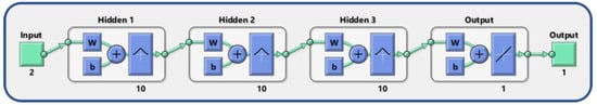 This section describes the materials and methods used to obtain results. The neural network toolbox in Matlab 2020b is used to train and test the deep neural network. A PC with Intel Core i9 is used with 32 GB RAM. The structure of the network is shown in Figure 2; it is comprised of: 2 inputs, 3 hidden layers with 10 neurons each, and 1 output layer with 1 neuron which gives a single output.