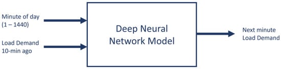 We observe that the deep network takes two inputs: minute-of-day, which is a single value ranging from 1 to 1440, representing each minute of the day; and the load demand, which was measured 10 min ago. Likewise, the output provides a single value, which is the forecast demand of the next minute.