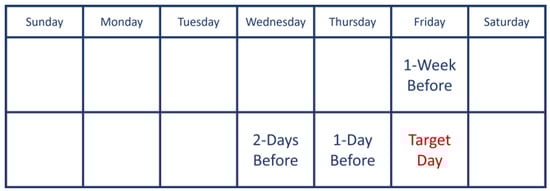 Training of the DNN architecture is performed by utilizing the 1 min real load demand of: one day before, two days before, and the respective day one week before. Figure 4 exhibits an example of the training dataset assembly process adopted in the current work. The goal of the assembled dataset is to capture the most recent load dynamics (recent days), as well as the general behavior of the resident (week before) [,]. It should be noted, we refer here to the “target day” as the day for which a specific network is trained. We choose this term over “test day” because it is the only day for which the network is trained. Each time the target day changes, the training data is re-assembled, and the network is re-trained. Moreover, the “target day” is separate from the target data used in training, which comes from the three training days marked in blue.