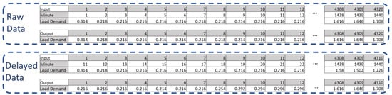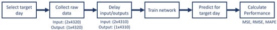 The training and testing procedure is explained through the flowchart in Figure 5. First, the target day for the network is selected. Second, the respective raw training data for the target day is collected, as shown in the example in Figure 4. The minute-of-day input is constructed from a numeric vector, which increases from 1 to 1440 and is repeated for each day. The load values of the three days are taken as both input and output to the network, which are delayed appropriately in the next step. To create the delays, the first 10 samples of the output load data are removed. Similarly, the first 10 min-of-day inputs are removed. Finally, the last 10 samples of the input load data are removed. An example of the input and outputs, both raw and after applying the delay, is shown in Figure 6. Once the delays are applied, the size of the training input/output is reduced from 4320 samples to 4310 samples. The network is then trained using the Levenberg–Marquardt training algorithm. Next, a prediction is made for the target day by feeding the minute-of-day and delayed load inputs using the same delaying procedure, which produces test inputs of a size of 1430 samples. Lastly, the performance of the network for the target day is calculated using the performance metrics.