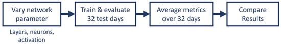 Analysis is performed to determine the optimum number of layers and number of neurons for each layer. The procedure for evaluating the network parameters is shown in Figure 7. A network parameter (e.g., layers or activation function) is first changed, and then the network is trained and evaluated for 32 target days. The performance metrics are calculated for the prediction of each target day and then averaged over the total 32 days. Averaged performance metrics results are then compared to select the parameter for the network. A total of 8 layer and neuron combination scenarios are tested, as well as 15 different activation functions.