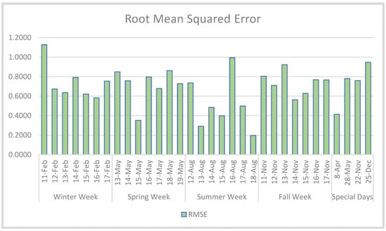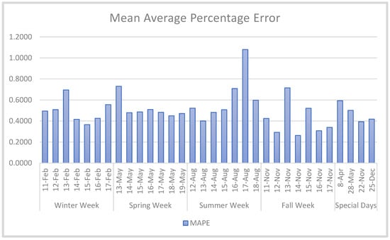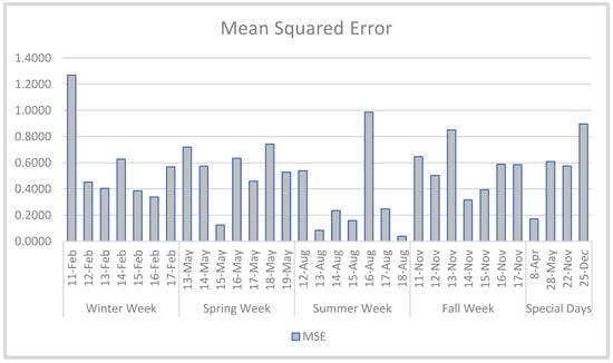 The obtained results per week and per special day for each measure are given in Figure 8, Figure 9 and Figure 10 in the form of comparative bar graphs of the MSE, RMSE, and MAPE, respectively. Similar to Table 5, it can be observed in Figure 8 and Figure 9 that the week with the lowest MSE and RMSE is in summer. The special day with the lowest MSE and RMSE is Easter Day.