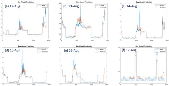 It should be emphasized that in Figure 11, we clearly see the stochasticity of the residential load as well as the abrupt changes in loads. More particularly, the real curve (blue line in Figure 11) exhibits high variation, while the peak load appears to be shifted from day to day. For instance, there is a peak around the 520th min of the day on 12 August, while the next day, this peak is shifted to the 560th min, and two days after, there are two peaks, one at the 520th min and a second at the 550th min. Further shifting occurs for 15 August, where the peak appears around the 530th min, and for 16 August the peak has been shifted to the 440th min. Lastly, for 17 and 18 August, which coincide with a weekend, there is a peak around the 500th min, while those peaks have changed shape and are not as high as those of the weekdays. Additionally, to further illustrate the stochasticity of the residential load, we observe that there is a period of high variation load in the middle of the day for the weekdays, while this intense variation is not present on Saturday (17 August) and appears in the last third of the day on Sunday. Overall, based on observation of the load patterns in Figure 11, we observe that there are a few areas that exhibit smooth load demand.
