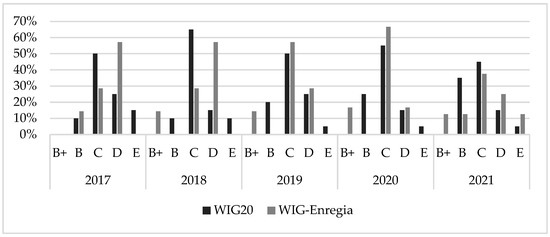 Based on the score obtained by a given company each year, in accordance with the methodology proposed by Czaja-Cieszyńska, Kordela, and Zyznarska-Dworczak [17] the non-financial reports were rated and classified on a 5-grade scale from A+ to E. First and foremost, it should be noted that none of the analyzed companies (either WIG-Energia or WIG20) managed to obtain an A+ or A rating. The non-financial reports ratings in S category for the WIG-Energia and WIG20 companies are shown in Figure 2.