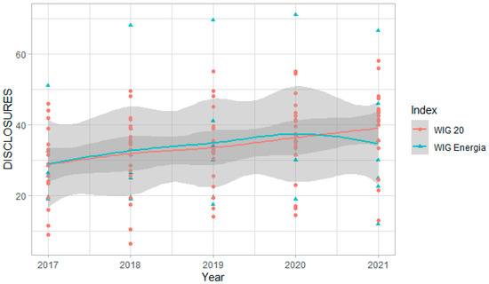 Using a scatter plot with LOESS to further assess the advancement level of non-financial reports filed by the studied companies (Figure 3), it is possible to notice that there are not any statistically significant differences between the social disclosures made by the WIG20 and WIG-Energia companies. In both cases, an upward trend sustained up to 2020, which means that the energy companies year by year reported more and more disclosures. Only the last year covered by the study showed a slight drop in the mean value of the extent of disclosures made by the WIG-Energia companies. As mentioned before, the reason for this state of affairs may be the inclusion of two new companies in the WIG-Energia index in 2021, in whose case the extent of disclosures was smaller than that shown by the other companies making up the index.