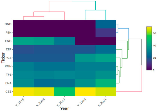 The upper part of the map is distinctly dominated by cold colors, which means that the corresponding companies made very few or no disclosures—these are e.g., the companies OND and PEN, which joined the WIG-Energia index as late as in 2021 (see Table 3), so the previous years were not covered by the study (extent of disclosures equal to 0). The majority of companies are marked blue and green, which corresponds to the disclosure level of 20–40. The highest disclosure level was shown by the CEZ company (marked yellow). The heatmap does not show any red or orange colors, which means that none of the companies demonstrated a very high disclosure level.