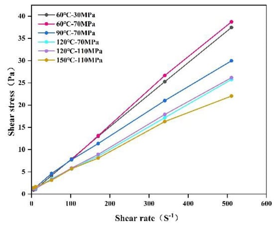 Figure 2 and Figure 3, respectively, show the relationship between the rate of shear and shear stress measured in rheological experiments under high temperature and high pressure for drilling fluid and cement slurry. It is evident that the temperature has a stronger impact on the sheer viscosity of both the drilling fluid and cement slurry, while pressure has less impact. Three common rheological models (Bingham model, power-law model, and Herschel-Buckley model described by Equations 1, 2, and 3, respectively) were used to fit the experimental data, and the most suitable rheological model was selected according to the correlation coefficient R2 of the fitting results. The behaviour of the drilling fluid was best fitted with the Bingham model, and the cement slurry was best fitted with the Herschel-Buckley model. According to the temperature and pressure at the downhole of well X, the rheological parameters (see Table 1 below) fitted at 90 °C, −70 MPa were selected as the basis for the calculation of the follow-up displacement model and ECD.