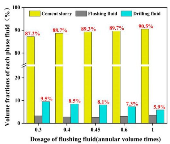 Volume fractions of each phase fluid in annular at the end of displacement with different dosages of flushing fluid.