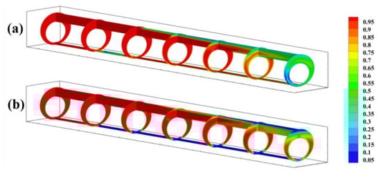 When studying the injection sequence of the pad fluid, the dosage of the spacer was 0.5 times of the annular volume of the cementing segment, and the dosage of the flushing fluid was 0.1 times the annular volume of the cementing segment. Figure 6 shows the volume fractions of each phase fluid at the final moment with different annular volume multiples occupied by different dosages of spacers. Figure 7 shows the volume fractions of each phase fluid at the final moment with different annular volume multiples occupied by different dosages of flushing fluid. Figure 8 shows the colour maps of the volume fractions of the wide side and narrow side of the annulus at the end of displacement with 0.6 times the dosage of pad fluid. Figure 8 shows the colour map of the axial velocity distribution of the wide side and narrow side of the annulus at the end of displacement with 0.6 times the dosage of pad fluid.