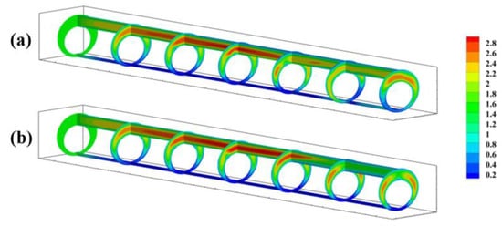 Figure 8 and Figure 9 show the section of the wellbore along the middle position in the upward axial direction. As can be seen from the colour map of the volume distribution of the cement slurry at the end of displacement (Figure 8), when pad fluid equal to 0.6 times the annulus is injected, the injection of the flushing fluid can better displace the remaining drilling fluid in the narrow gap of the annulus, and more effectively fill cement slurry at the narrow edge compared to the spacer. Comparing with the colour map of the axial velocity distribution at the end of the displacement (Figure 9), it is observed that the flow velocity in the wide side of the annulus is considerably higher than that in the narrow side. When injecting the flushing fluid, the flow velocity at the end of the narrow side of the annulus is significantly improved, with the flow velocity at the initial end of the narrow side being almost the same.