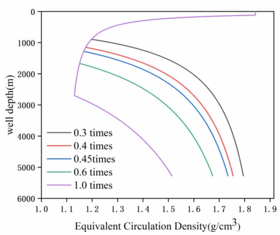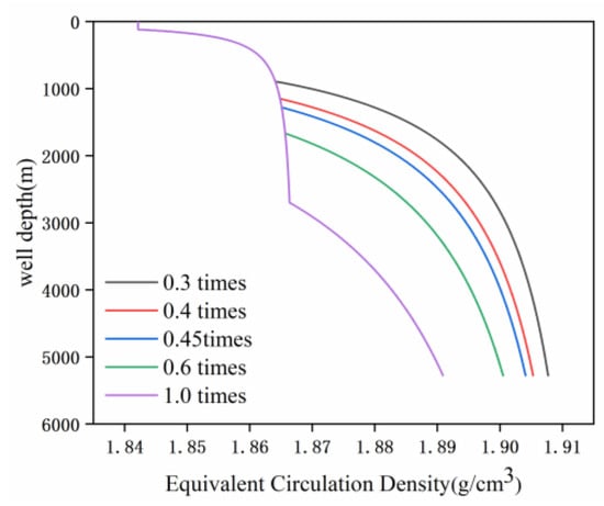 From Figure 13, it can be concluded that under the condition of injecting the same dosage of pad fluid, irrespective of the sequence used, the final downhole pressure remains constant. The ECD at the top of the hole increases or decreases with different injection sequences. In the column structure of spacer–flushing fluid–cement slurry, the annulus equivalent density varies from 1.949 g/cm3 to 1.993 g/cm3. The window is 0.044 g/cm3. However, in the column structure of flushing fluid–spacer–cement slurry, the annulus equivalent density varies from 1.881 g/cm3 to 1.967 g/cm3. The window is 0.086 g/cm3. Comparing the changes in annulus equivalent density of these two column structures, the sequence of spacer–flushing fluid has a smaller range of impact on the annulus ECD. Therefore, using this structure, the formation pressure can be adjusted and balanced more effectively.