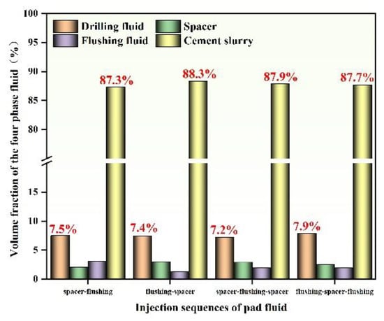 From Figure 12, it is evident that when the injection sequence of the pad fluid is flushing fluid–spacer, the highest displacement efficiency is 88.3%, while when the injection sequence is spacer–flushing fluid, the lowest efficiency is 87.3%, which is 1% lower than that in the former sequence. The reason is that when the injection sequence of the pad fluid is flushing fluid–spacer, the injection of the flushing fluid can flush and dilute the drilling fluid, and also dilute a part of the later injected high-density spacer. Hence, the pad fluid can be displaced effectively when cement slurry is injected, thereby achieving the highest displacement efficiency. When the injection sequence of the pad fluid is spacer–flushing fluid, although the high-density spacer can generate a density contrast to effectively displace the drilling fluid, the subsequently injected low-density flushing fluid dilutes not only the spacer, but also the subsequently injected cement slurry, leading to reduced displacement efficiency of the cement slurry.