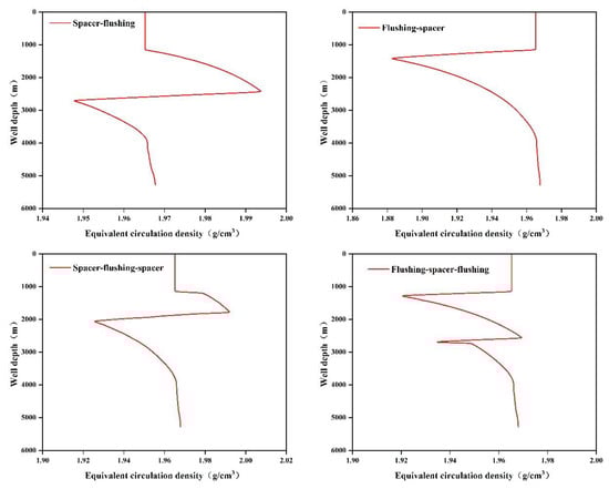 When studying the injection sequence of the pad fluid, the overall dosage of the spacer was 0.5 times the annular volume of the cementing segment, and the overall dosage of the flushing fluid was 0.1 times the annular volume of the cementing segment. Figure 10 shows the fluid volume fraction of the four-phase fluid, at the final moment, with different injection sequences of the pad fluid, and Figure 12 shows the ECD with different injection sequences of the pad fluid.
