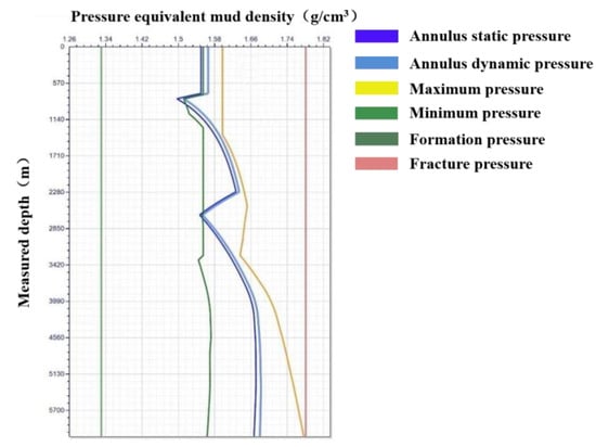In order to improve the cementing quality of this well and guarantee the operation safety and displacement efficiency, the original design scheme of the cementing operation of this well was optimised in the current study. The schemes before and after optimisation are, respectively, Scheme 1 and 2, as shown in Table 2. After optimisation, the dosage of pad fluid was increased, and the injection sequence was changed. The theoretically calculated displacement efficiency was increased by 2%, which was consistent with the aforementioned conclusions. Further calculation of the annulus ECD at the end of the displacement is shown in Figure 14. The ECDs are all within the safety density window, which can guarantee operation safety.