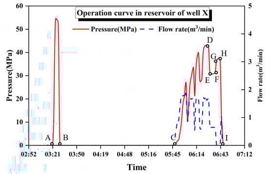 The process of the cementing operation of the reservoir casing section in this well is shown in Figure 15. The construction was carried out during 03:15–06:42. Section A,B was the flushing pipeline and was at the pressure test stage. The pressure increased up to 54 MPa, and was stabilised for 5 min. Subsequently, 8.7 m3 of flushing fluid, 35 m3 of spacer, 2.0 m3 of flushing fluid, and 68.3 m3 of cement slurry were sequentially injected in section B,C. Clean water was injected after the point C. Then, the displacement process started. The flow rate was reduced in section D,E to prepare for bumping in Section F,G. Section H,I included emptying and waiting for cement setting with annular pressure at 4 MPa. The entire operation process was safe, and cementing was successfully completed. After 48 h of waiting for the cement to set, the results of sonic amplitude logging showed that the pass rate of the first interface was 100%, and the pass rate of the secondary interface was 70.6%, which was 8.8% higher than the pass rate of the secondary interface of the adjacent well. The cementing quality was improved significantly.