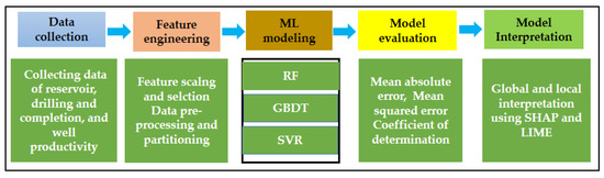 Recent studies have focused on interpretability to comprehend how ML models learn from data, the learned patterns, and how they generate specific predictions [26,27]. In this research, we utilized three supervised ML algorithms to predict the well productivity in the Eastern Sulige gas field. Furthermore, the study employed Shapley additive explanations (SHAP) and local interpretable model-agnostic explanations (LIME) techniques to reveal the important features and provide an underlying rationale for the prediction results at the global and local levels. These approaches are described in Section 3.