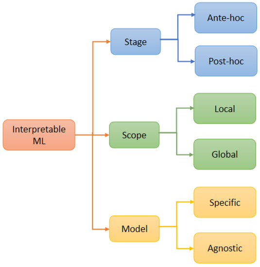 Model interpretability refers to the degree to which the predictions of a ML model can be understood by a human [25]. In recent years, various interpretable ML techniques have been proposed. These techniques can be classified into different groups based on application stage, interpretability scope, and model dependency as illustrated in Figure 3 [36,37].