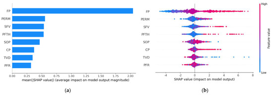 Figure 6a shows global feature importance according to the average of the absolute SHAP values for each input variable. A larger mean SHAP value corresponds to a greater influence on the well AOFP. It can be clearly observed from Figure 6a that variable FP (flowing bottom-hole pressure) is the most significant variable, followed by variables PERM (matrix permeability) and SFV (slurry fluid volume).