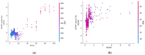 Feature dependence plots: (a) Perforation thickness (PFTH) vs. Slurry fluid volume (SFV); (b) Matrix permeability (PERM)vs. Proppant fluid ratio (PFR).