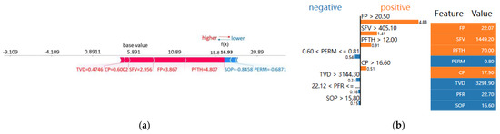 Figure 6b shows the SHAP summary plot, where each point is a Shapely value for each feature and individual data point. The vertical color bar demonstrates low to high transition from blue to red. The plot allows us to analyze the feature’s importance together with its magnitude and effect direction. Figure 6b shows that the variable FP has a positive impact on the well AOFP. As the value of FP increases, the SHAP value increases, increasing well productivity. By contrast, an increase in TVD (well true vertical depth) will decrease the value of well AOFP.