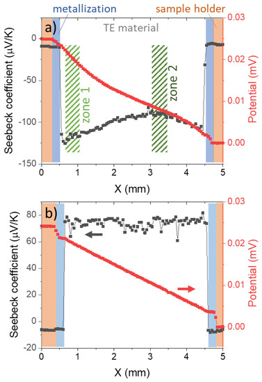 Seebeck coefficient and electrical potential line scans of legs after contacting before TEG joining: (a) n-type and (b) p-type. In (a), it can be noticed that the slope of the potential in zone 2 is steeper than within zone 2, where the Seebeck coefficient is smaller.