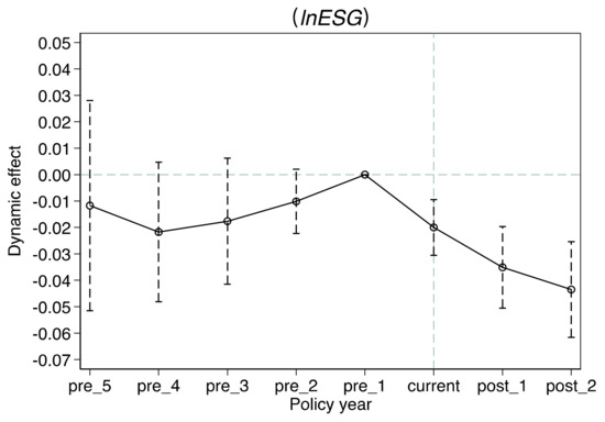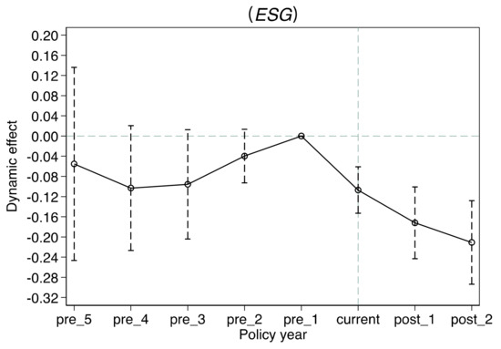 where are relative year variables indicating . If company is in the pilot city, equals one; otherwise, it equals zero. As the ESER policy was implemented in three batches in 2012, 2014 and 2015, the range of values for was . The benchmark time category is . Thus, the parameter of interest, , captures the difference in ESG performance between pilot and non-pilot cities. The other variables are defined in Equation (1).