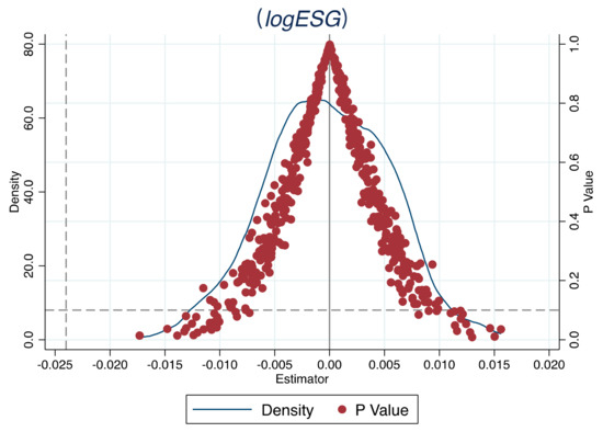 Placebo test (ESG). Notes: This figure displays the distribution of the density, p value and estimator. The vertical dashed lines represent actual estimates.