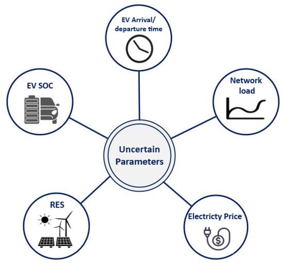 The RES has the advantage of providing extra electricity capacity and creating more resilience to the system. However, due to their intermittent nature, these energy sources present challenges and inefficiencies in energy production. The fluctuating nature of RESs can create imbalances in the supply and demand of electricity. However, EVs can help to mitigate these issues by serving as mobile energy storage systems. The use of EVs as energy storage can help to increase the penetration of RESs in the electric grid. By allowing excess RESs’ energy to be stored and used later, EVs can help to reduce the curtailment of these resources, which occurs when energy production exceeds demand, and the excess energy is not utilized. Researchers of [16] considered demand and supply balance by contributing to the electricity demand response while the comfort of customers is provided. From another side, the charging behavior of EV owners has a direct impact on the uncertainty of the integrated power and transportation network. In this regard, a suitable mechanism for modelling the stochastic nature of consumers’ charging patterns [17] is vital. In [18], the authors declared that modelling a realistic and robust system cannot exist without considering the uncertainty of energy resources and electrical network load. The uncertain parameters, which are modelled in different articles, are shown in Figure 1.