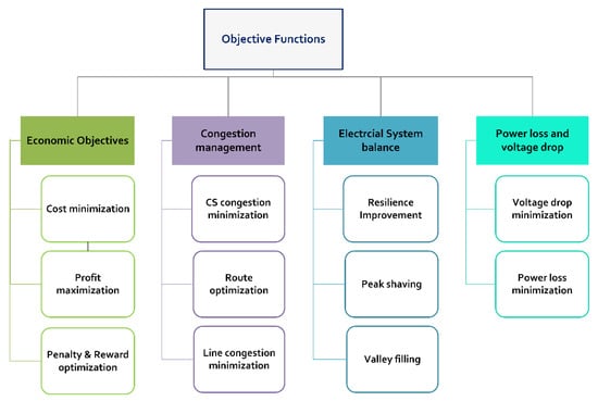 Charging management of EVs in smart systems is not possible without proper management strategies. Uncoordinated EV charging is a situation when EVs can start charging immediately by the time they arrive at the CS. The uncoordinated charging of EVs through CSs connected to the distribution system (DS) could cause extra load and congestion to the system [19]. Coordinated charging, on the other hand, is an energy management approach in which the time and power of charging and discharging modes are optimized. Moreover, technical constraints of the electrical grid, EV battery requirements, and CS capacity are considered. To mitigate the negative impacts of uncontrolled charging of EVs, a system-constrained coordination method is proposed in [20]. In this research, the proposed management scheme helps in mitigating extra pressure on the grid as well as congestion and traffic of charging spots. Another coordinated EV charging/discharging is proposed in [21] in the format of a cooperative strategy in which EVs of a building can interact with each other in V2V mode and lower the consumption of the electrical grid, with the help of vehicle-to-load (V2L), minimizing the cost. The objective functions which are optimized through different coordinated management schemes in different research articles are shown in Figure 2.