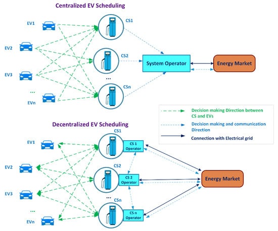From the multi-stakeholder’s perspective in EV charging management, each one follows its profit. Two or more e-mobility stakeholders, including distribution system operators (DSO), CS operators (CSOs), EV owners, aggregators, and electricity market operators are considered in the reviewed papers. In this regard, optimal EV scheduling in multilevel stakeholder systems requires an efficient management scheme. Therefore, it is necessary to optimize the operation of CSs and coordinate management of electrical systems, while the satisfaction of customers in financial and time efficiency is met. In [22], the convenience of EV owners as the lowest level of stakeholders is evaluated. Power loss and voltage deviation of the grid and CS traffic management are surveyed through a fuzzy logic method. Moreover, it is essential to model the benefits of CSs to assess their economic viability, plan infrastructure development, and make policy decisions. By analysing factors such as the demand for charging, the cost of installation and operation, and the impact on the grid, stakeholders can make informed decisions about infrastructure development and investment to support the growth of the electric vehicle market and the development of a sustainable transportation system. In this regard, the price of electricity for charging electric vehicles is considered in a suitable scheme in CSs. From the perspective of coordinated EV scheduling, CS charging management can be categorized into three different decision-making schemes: centralized, decentralized, and hybrid. Centralized decision-making for EV charging is defined as control and management of charging/discharging EVs by a central operator or aggregator, which has the responsibility to receive the data from EVs and the electrical grid and arrange the scheduling. Additionally, the charging costs of EV owners besides the DS constraints is necessary [23]. The scheduling problem aims to minimize electricity costs of CSs and EV owners, controlling queues of EVs, minimizing their waiting time, avoiding charging in high consumption hours, etc. In [19], a centralized, coordinated EV charging in a grid-connected system framework is offered. Decentralized charging scheduling is developed in such a way that EV owners can communicate with the CSO by sending and receiving signals [24]. In this regard, cost and waiting time minimization and congestion avoidance in each CS is done through negotiation between CSs and EVs in a distributed manner. Diagrams of centralized and decentralized EV scheduling are shown in Figure 3.
