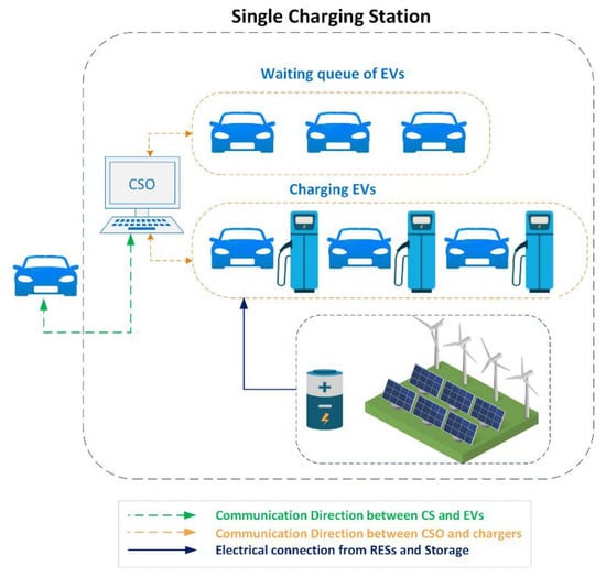 In recent years, the EV industry has grown, following the low carbon emission reduction policy worldwide. EVs bring various benefits to the transportation system, due to finite features of fossil fuels. However, the increasing number of EVs results in some challenges in an integrated electrical and transportation system: charging facilities offering services to EV owners with the least waiting time, growing congestion of lines due to the electricity consumption from the grid, increasing the use of RESs to lower the dependence of electricity from the upper grid, intermittency of RESs’, as well as EVs’, random behavior, arrangement, and operation inside a CS. Moreover, EV charging loads should not exceed the charging power capacity of each CS, while user satisfaction on receiving their minimum SOC is required. Therefore, managing a CS and, in other words, charging scheduling of EVs, is necessary to meet different stakeholders’ benefits and requirements. In this regard, several research works investigated the charging scheduling of one or several EVs in a single CS from different technical and economical perspectives. The framework of a single CS system with different communication parts is shown in Figure 4.