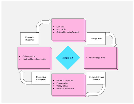 From the point of view of congestion management in a single-CS system, both EV owners and the owners of CSs face different issues. For example, flowing a large number of EVs into one CS results in a long waiting time for EV charging and negatively impacts user satisfaction. On the other hand, the higher waiting time affects the CS because EV owners leave the charging spot in the queue traffic condition. In [25], these challenges are contributed to the research through a pricing scheme for a dual charging mode (AC and DC) capability. An optimal charging scheduling possibility is presented in this research, which helps in lowering the drop rate of EV charging and minimizing the waiting times. In [26], a heuristic fuzzy inference algorithm is used to minimize the objective of waiting time on a public CS. The research works focused on congestion of CS as well as other objectives are presented in Figure 5.