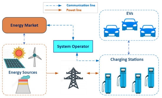 In this regard, several research papers surveyed the charging scheduling of multiple CSs from different technical and economic aspects and presented strategies to handle smart energy system management. The framework of an integrated electrical and transportation system is shown in Figure 6.